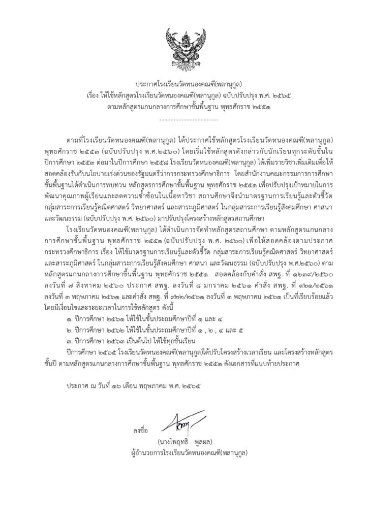 ประกาศโรงเรียนวัดหนองคณฑี(พลานุกูล) เรื่อง ให้ใช้หลักสูตรโรงเรียนวัดหนองคณฑี(พลานุกูล) ฉบับปรับปรุง พ.ศ. 2565 ตามหลักสูตรแกนกลางการศึกษาขั้นพื้นฐาน พุทธศักราช 2551
