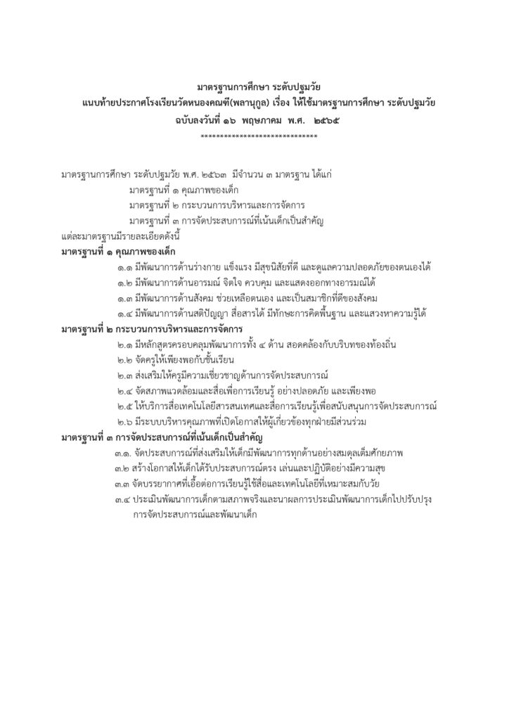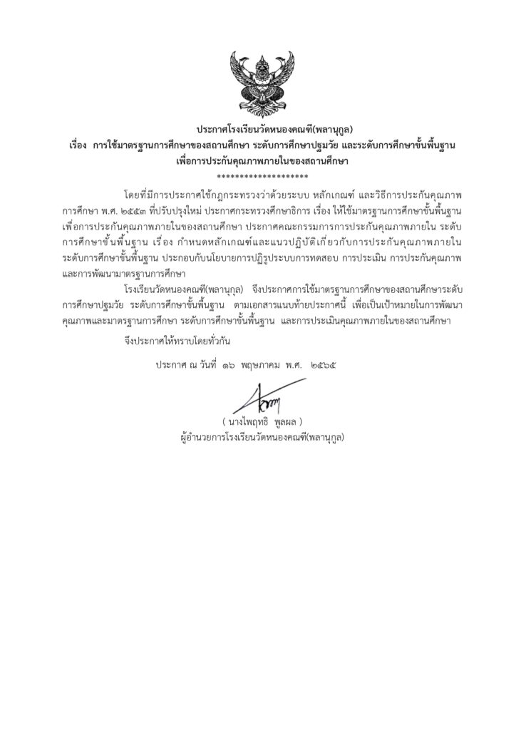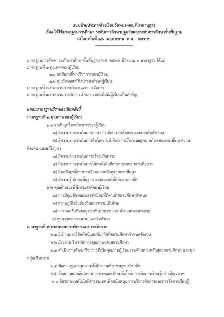 ประกาศโรงเรียนวัดหนองคณฑี(พลานุกูล) เรื่อง การใช้มาตรฐานการศึกษา ระดับการศึกษาปฐมวัย และระดับการศึกษาขั้นพื้นฐาน เพื่อการประกันคุณภาพภายในของสถานศึกษา