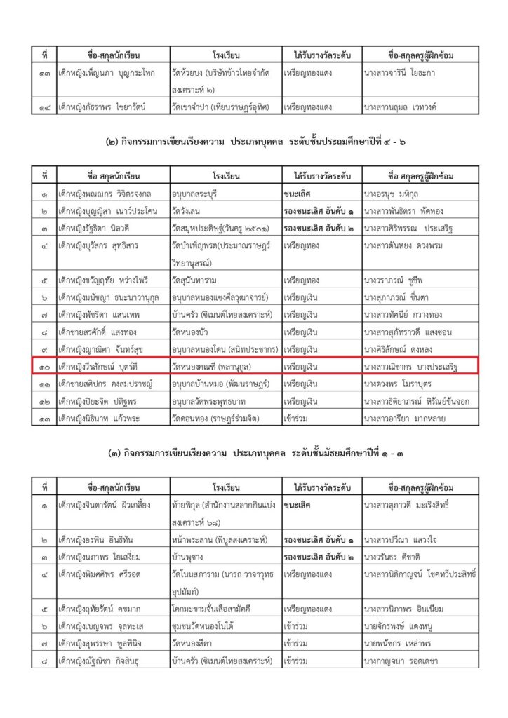 วันที่ 12 กรกฎาคม พ.ศ. 2565 นางไพฤทธิ พูลผล ผู้อำนวยการโรงเรียนวัดหนองคณฑี(พลานุกูล) ได้ให้เกียรติมอบเกียรติบัตรให้แก่นักเรียนที่ได้รางวัลระดับเหรียญเงินและเข้าร่วมในการแข่งขันทักษะภาษาไทย “โครงการรักษ์ภาษาไทย” ระดับเขตพื้นที่การศึกษา เนื่องในสัปดาห์วันภาษาไทยแห่งชาติ ปี 2565 เรียงตามกิจกรรมดังนี้1.กิจกรรมคัดลายมือประเภทบุคคล ระดับชั้นประถมศึกษาปีที่ 1-3 ระดับเหรียญเงิน ได้แก่ เด็กชายพิชัย อินทเสน ครูผู้ฝึกสอน นางสาวสุนิดา พงศ์นิรันดร์2.กิจกรรมคัดลายมือประเภทบุคคล ระดับชั้นประถมศึกษาปีที่ 4-6 เข้าร่วมได้แก่ เด็กหญิงมนัญชนก ทรัพย์คงเจริญ ครูผู้ฝึกสอน นางสาวณิชากร บางประเสริฐ 3.กิจกรรมการเขียนเรียงความประเภทบุคคล ระดับชั้นประถมศึกษาปีที่ 4-6 ระดับเหรียญเงิน ได้แก่ เด็กหญิงวีรลักษณ์ บุตร์ดี ครูผู้ฝึกสอน นางสาวณิชากร บางประเสริฐ ขอแสดงความยินกับนักเรียนและครูผู้ฝึกสอนทุกท่าน มา ณ ที่นี้